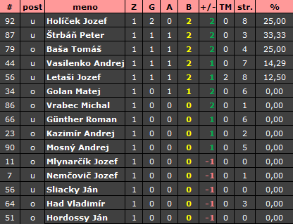 Kanadské body: Holíček 2+0, Štrbáň 1+1, Baša 1+1, Vasilenko 1+1, Letaši 1+1, Golan 0+1