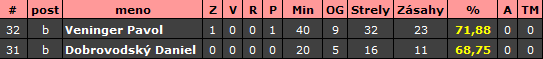 Kanadské body: Holíček 4+1, Štrbáň 2+3, Vasilenko 1+1, Letaši 1+1, Golan 0+2, Vrabec 1+0