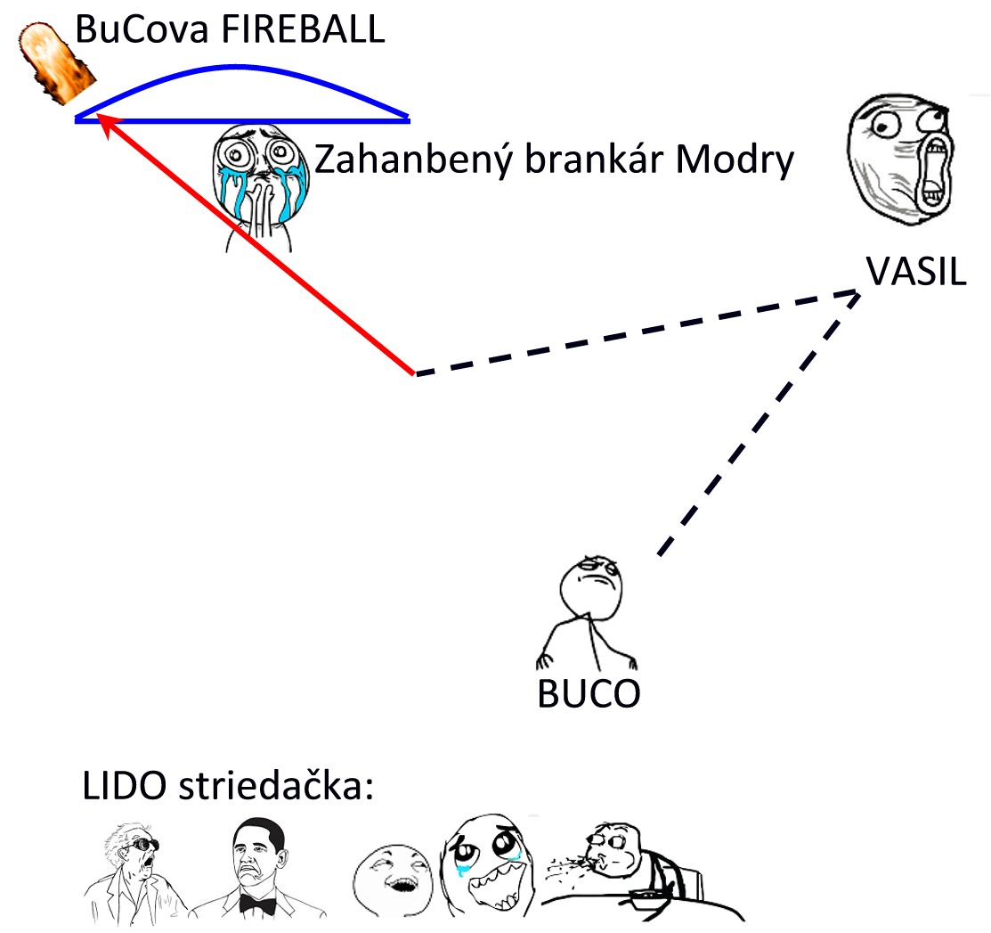 Buco hrajúci na poste obrancu vzal loptu na strede ihriska, dupotajúc si narazil loptičku s Vasilenkom a presne umiestnenou strelou k pravej žŕdke v čase 6:38 v prvej tretine... SKÓROVAL!! Oslavné chorály sa ešte dlho niesli trnavskou halou...