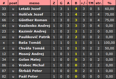 Kanadské body: Letaši 3+1, Holíček 3+1, Günther 3+0, Vasilenko 0+3, Kazimír 0+2, Paulikovič 0+2, Chvála 1+0, Mosný 0+1