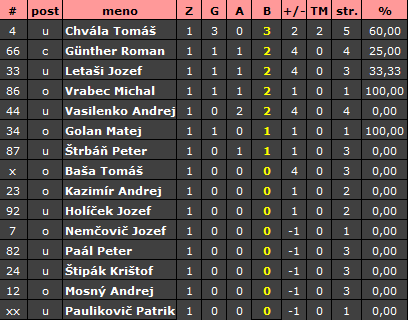 Kanadské body: Chvála 3+0, Vrabec 1+1, Günther 1+1, Letaši 1+1, Vasilenko 0+2, Golan 1+0, Štrbáň 0+1